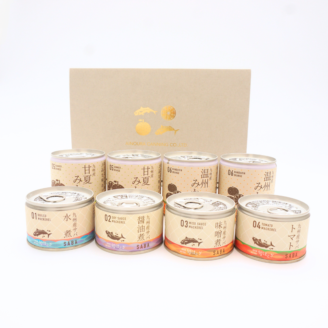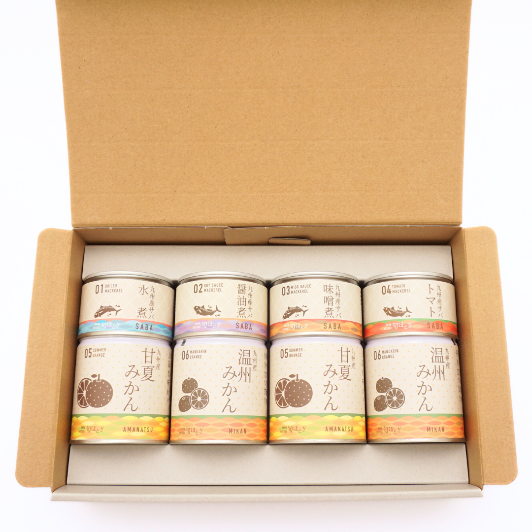 「旬ほとぎ」シリーズの人気商品サバ4種に、甘夏みかんと温州みかん缶詰を加えた8缶入りのセット。